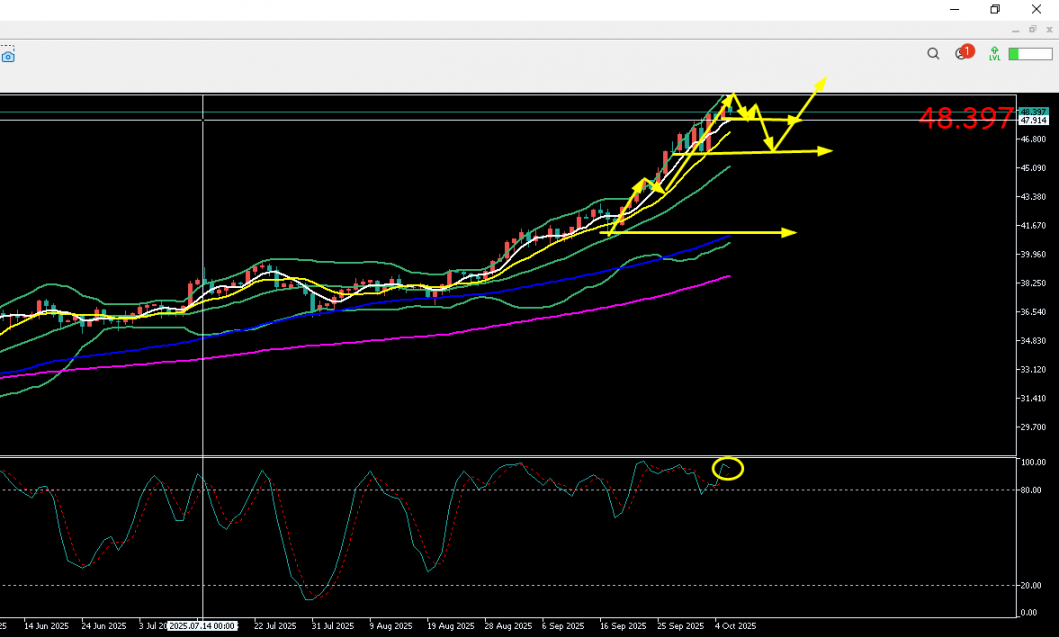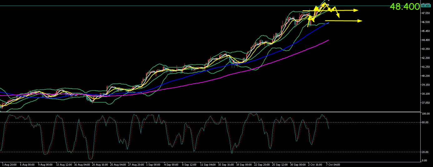 白银日线级别昨日收小阳,价格上涨动能有所减弱,高位盘整格局运行于日线5MA之上。午盘价格进一步向下试探5MA附近水平,关注该位置47.75一线突破情况操作。4小时级别,价格试探至布林中轨附近反弹,价格若能有效突破下方47.75附近,则有概率进一步向下试探下方60MA支撑附近46.4一线。白银日内整日运行水平超买严重,谨慎高位回撤。