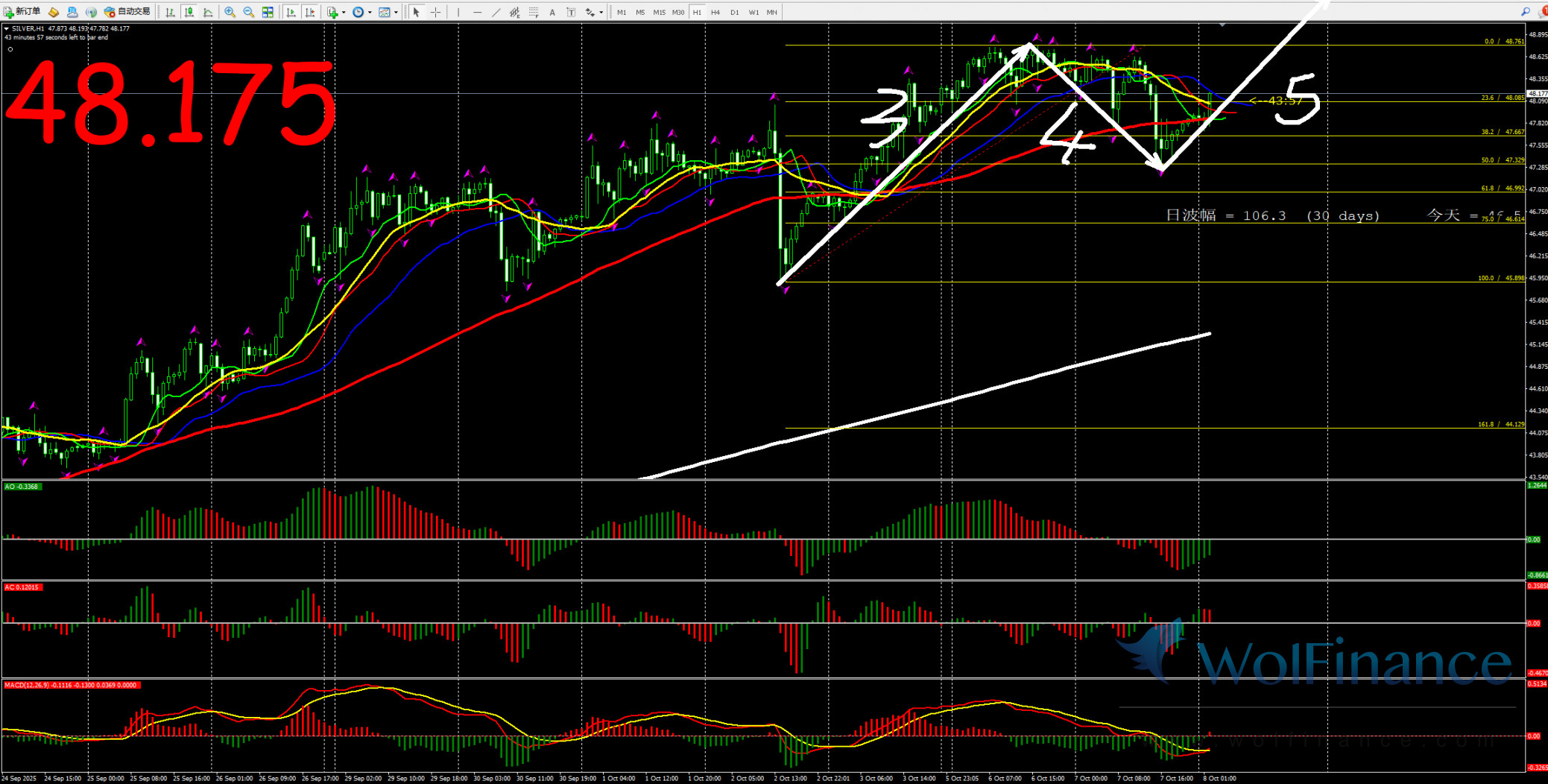 日线图目前处在3浪之中,关注3浪的行情走势。压力倾向在日线图49.10一线附近;支撑倾向在日线图50%(42.88)和61.8%(41.47)一线附近;四小时行情处在3浪走势;并关注上方压力49.10一线附近;1小时图AO零轴下绿色;AC零上红色,行情在小时图356日线之上运行;小时图关注49.10附近的压力;所以今日关注1小时图震荡行情。