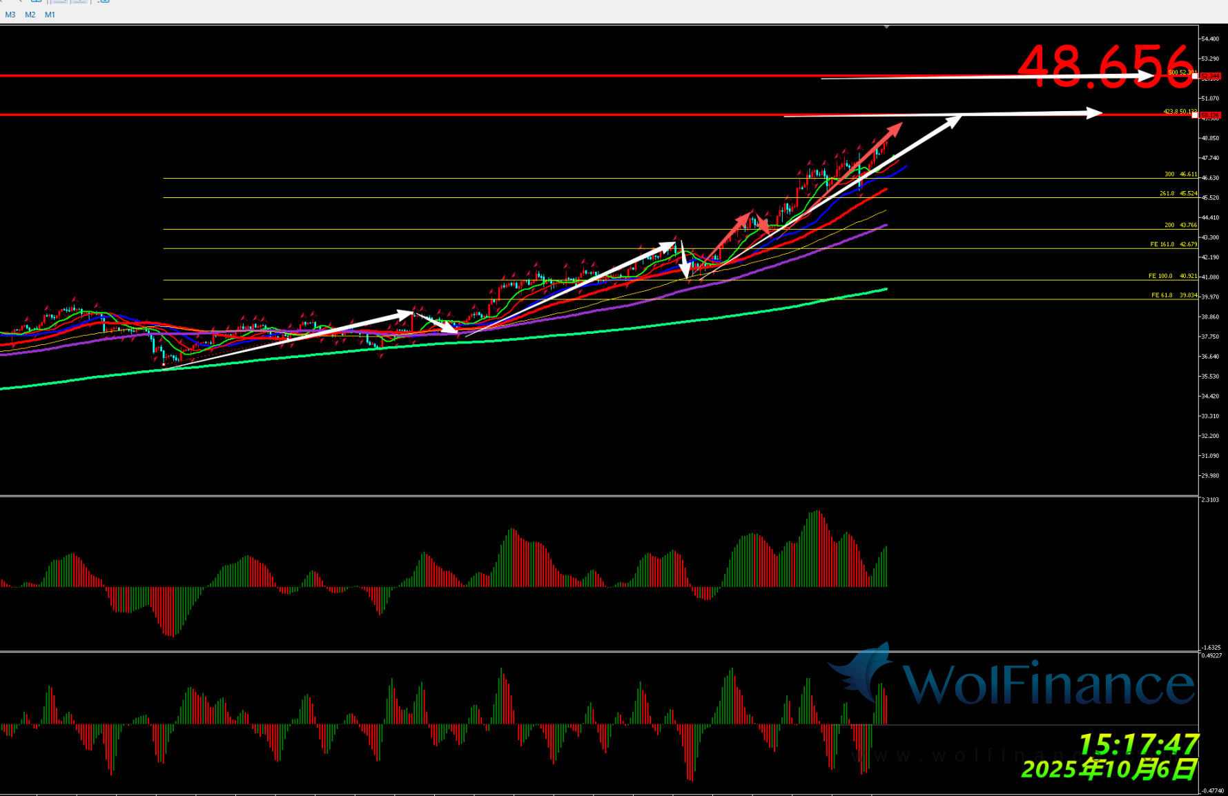 解析:日线AO绿色,AC红色,日线鳄鱼线缠绕向上;4小时AO红色,AC红色,鳄鱼线缠绕向上;银价上周五继续创出新高目前至40.481附近,12H图上看目前银价走得是主三浪上涨走势中理论上方关注50.13-52.34目标预期;银价自12H的120均线两次企稳后再次上涨,4H自36.95低点涨至43.04后回调至60均线下方41.14后再次上涨至当下48.69,从浪形上看银价目前判定为4小时的5-5浪预期的上涨预期中,上涨的最低标准反转线为2小时的蓝色线的蓝色线和60均线之间,上周银价跌破2小时的60均线判定为5-4浪调整,是故当下判定为4小时的上涨5-5-3浪中上方关注49.00-50.13-50.26目标预期,昨日银价高位震荡但跌破了15分钟的蓝色线和60均线在48.63-48.35之间做三角收敛震荡30分钟形成混沌点后混沌下破跌至2小时的89均线后银价再次上涨且创出新高,目前30分钟走出了5-5-3浪上涨态势,日内上方关注50.26-51.93-53.00预期。