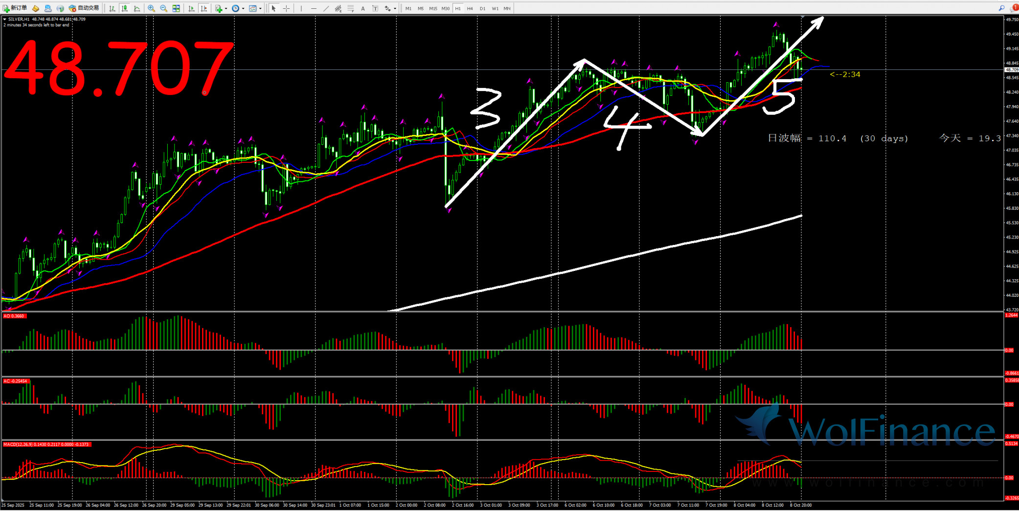 日线图目前处在3浪之中,关注3浪的行情走势。压力倾向在日线图49.10一线附近;支撑倾向在日线图50%(43.21)和61.8%(41.73)一线附近;四小时行情处在3浪走势;并关注上方压力49.60一线附近;1小时图AO零轴上红色;AC零下绿色,行情在小时图356日线之上运行;小时图关注49.10附近的压力;所以今日关注1小时图震荡行情。