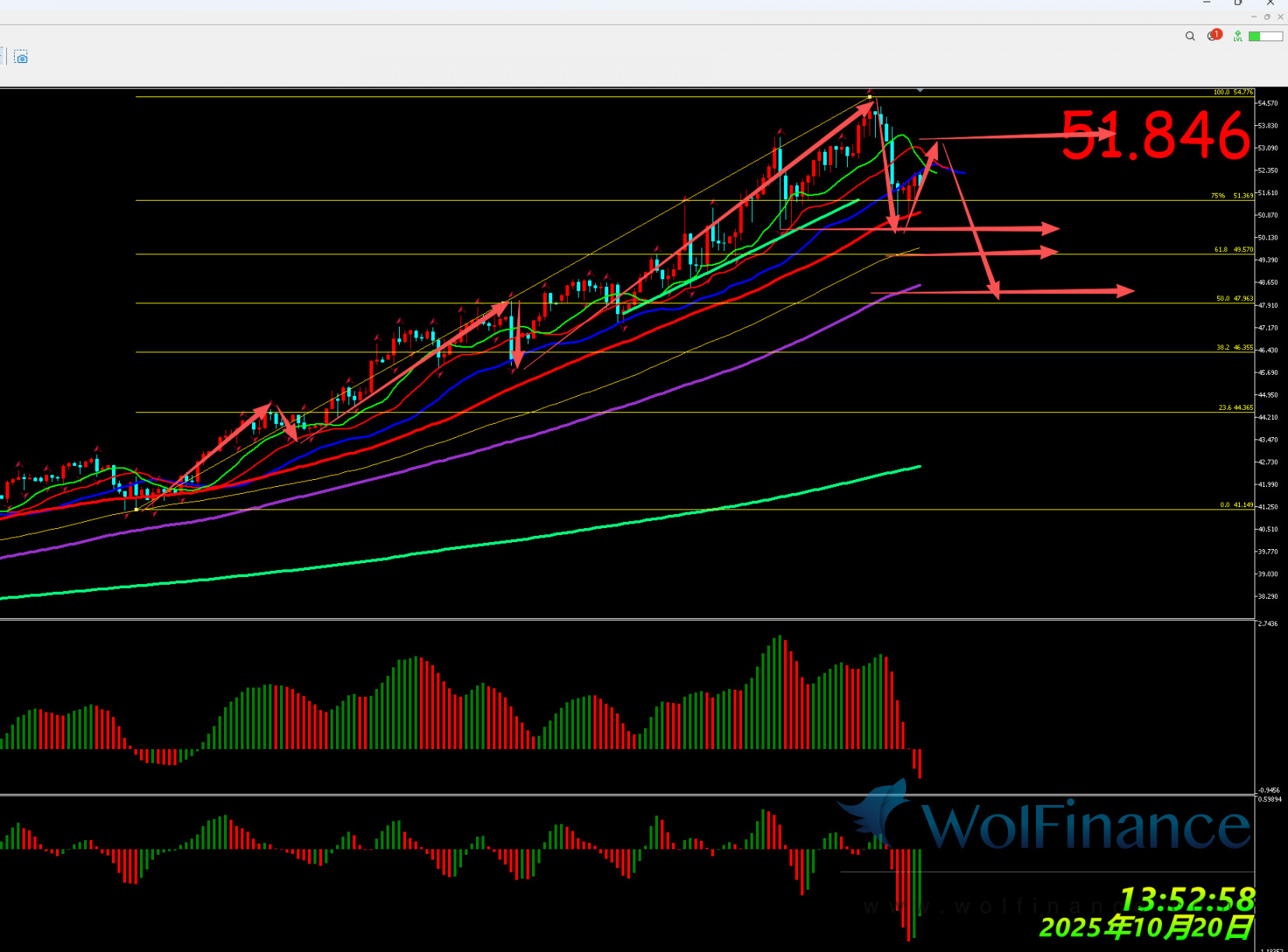 解析:日线AO红色,AC绿色,日线鳄鱼线缠绕;4小时AO红色,AC绿色,鳄鱼线缠绕向上;银价上周五继续创出新高目前至40.481附近,12H图上看目前银价走得是主三浪上涨走势中理论上方关注50.13-52.34目标预期;银价自12H的120均线两次企稳后再次上涨,4H自36.95低点涨至43.04后回调至60均线下方41.14后再次上涨至当下48.69,从浪形上看银价目前判定为4小时的5-5浪预期的上涨预期中,上涨的最低标准反转线为2小时的蓝色线的蓝色线和60均线之间,上周银价跌破2小时的60均线判定为5-4浪调整,银价冲击51.21后回落至2小时的蓝色线和60均线上方在48.38-51.21之间偏多震荡后再次涨至54.77后冲高回落且跌破了2小时的60均线和蓝色线至2小时的120均线附近后反弹,银价跌破了2小时的60均线后打坏了上涨结构且1小时银价跌破120均线是故目前判定银价在1小时和30分钟上属于主跌浪,银价最低跌至2小时的356均线附近和6小时的89-120均线支撑即48.57-47.35支撑后反弹,5分钟完成下跌5浪至47.37后目前反弹A浪至49.29后走出回调B浪打出低点47.65后,银价走着反弹c-3浪预期至A浪的高点49.47后回落,目前1小时完成了A浪,上周五银价反弹至1小时的60均线和89均线之间后回调至2小时的120均线附近判定为1小时的回调B浪且跌破2小时的356均线是故银价目前走5-3主跌浪下方关注46.33-45.71-44.72-44.10目标预期,若46.33-45.71支撑主则看30分钟的蓝色线和60-89-120均线反弹预期。