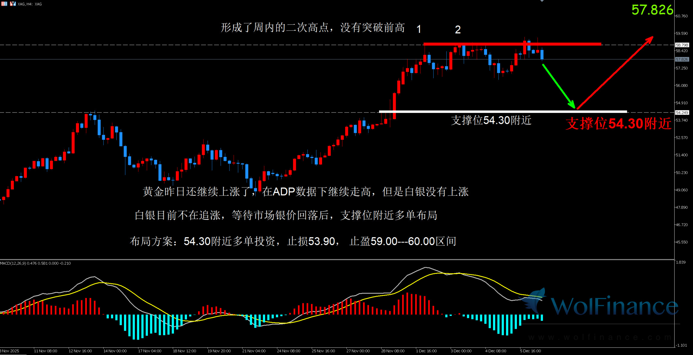 1. 白银技术图表显示目前K线支撑位54.50附近