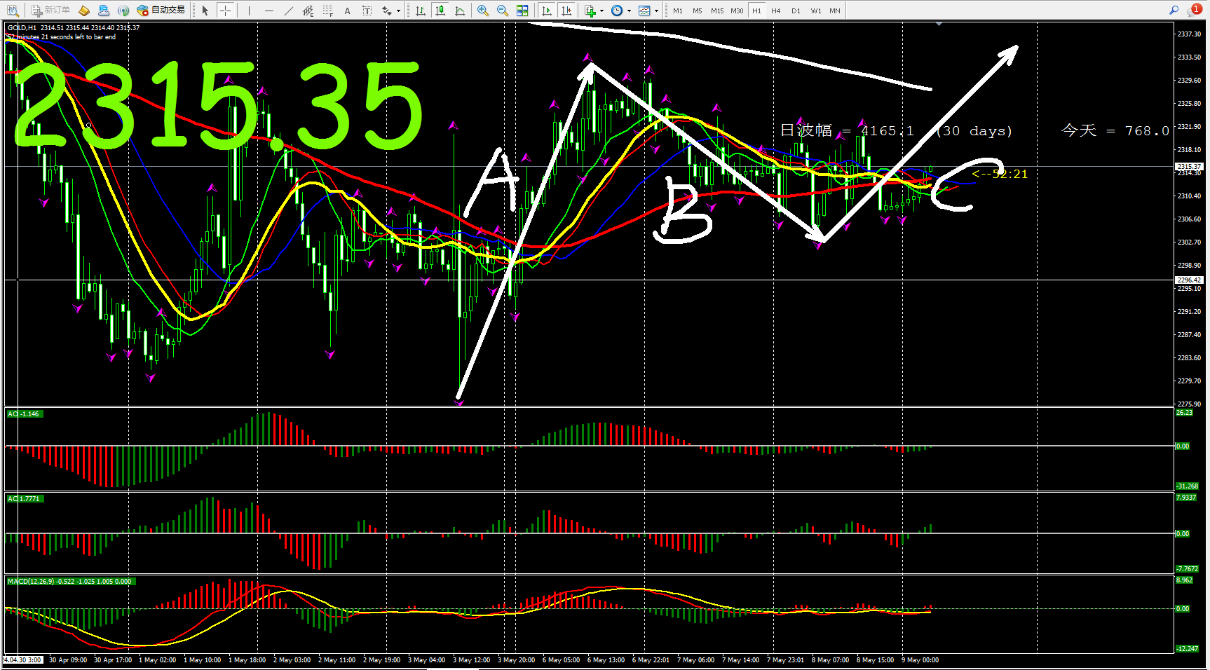1、黄金关注2311-13附近做多,止损2306;目标:2323;2333;2343;